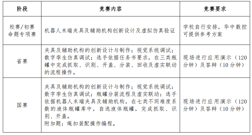 工业协作机器人及数字孪生技术创新应用专项赛涵盖工业协作机器人及数字孪生技术的认知、设计、优化、应用、创新等内容,分为校赛、省赛和国赛三个赛段开展。