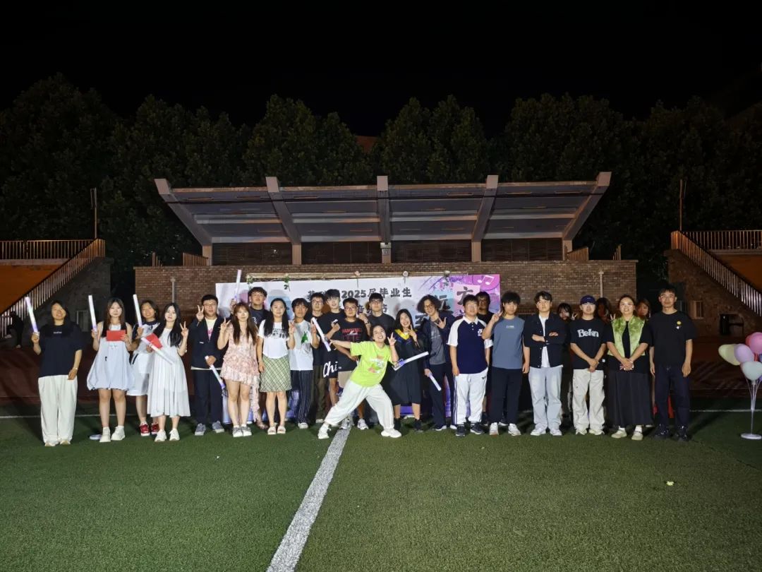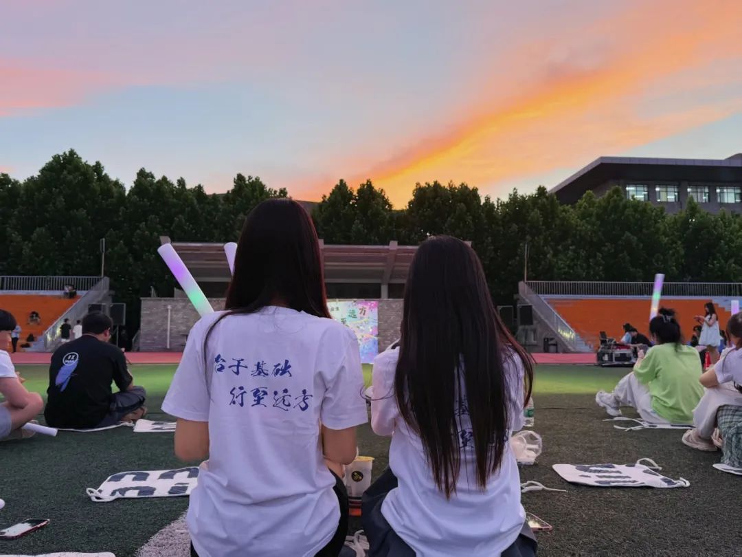 傍晚,草地毕业歌会上歌声如潮水般温柔地漫溢开来,暮色与音符一同荡漾。
